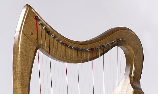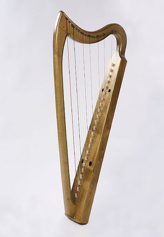 Our Kennetis bray harp is based on European harps played in the late 14th and 15th centuries. It was designed to be a modestly-priced bray harp with a bottom note of C below middle C, with the capability of fretting semi-tones and giving a satisfying buzz throughout the whole range. The soundbox is carved from a single block of wood,
